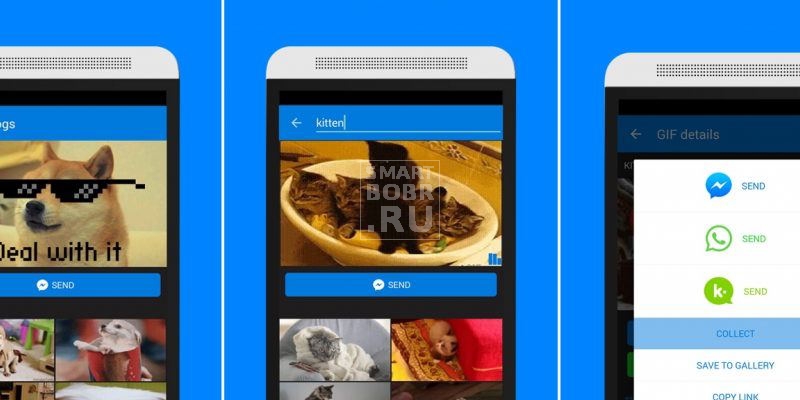 В арсенале приложения найдуются миллионы анимированных картинок и разных видео для любой ситуации. Не обошлось здесь и без смайлов. Кроме того, элементы разбиты на категории, в числе которых «реакции», «популярные темы» и многое другое.