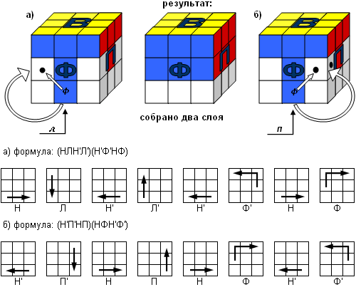 - Наша цель: отыскать нужный кубик и сначала вывести вниз на фасадную грань. Если он внизу - простым поворотом нижней грани до совпадения с цветом фасада, а если он в среднем слое, то его нужно сначала опустить вниз любой из операций а)или б), а потом совместить по цвету с цветом фасадной грани и проделать операцию третьего этапа а) или б). Результат: собрано два слоя.